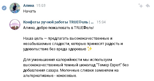 • После чего написали скрипт для чат-бота, добавили в него ассортимент конфет Заказчицы